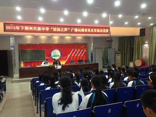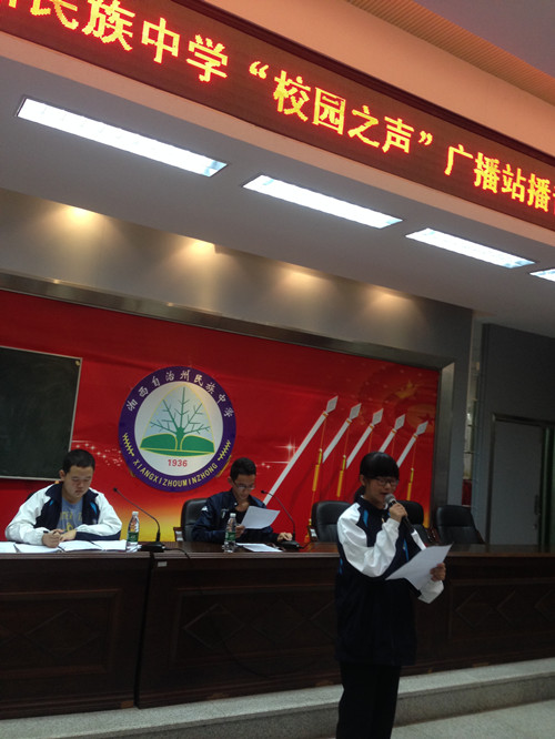 州民族中学“校园之声”广播站是学校为丰富学生校园生活,拓宽学生视野,发现身边的好事好人,弘扬先进,引领校园风尚,促进学生心理健康发展的一个平台。“校园之声”广播站由中英文播音员60余名成员组成,设有“时事速递”、“名家美文”、“滴水藏海”、“男生女生”、“流金岁月”、“环球旅游”等多个栏目,校园之声”广播站丰富了校园文化生活,弘扬了校园文化,培养了相当一批热爱新闻、热爱播音的专长生,深受全校师生好评。